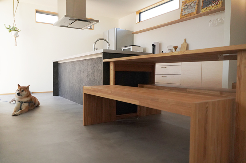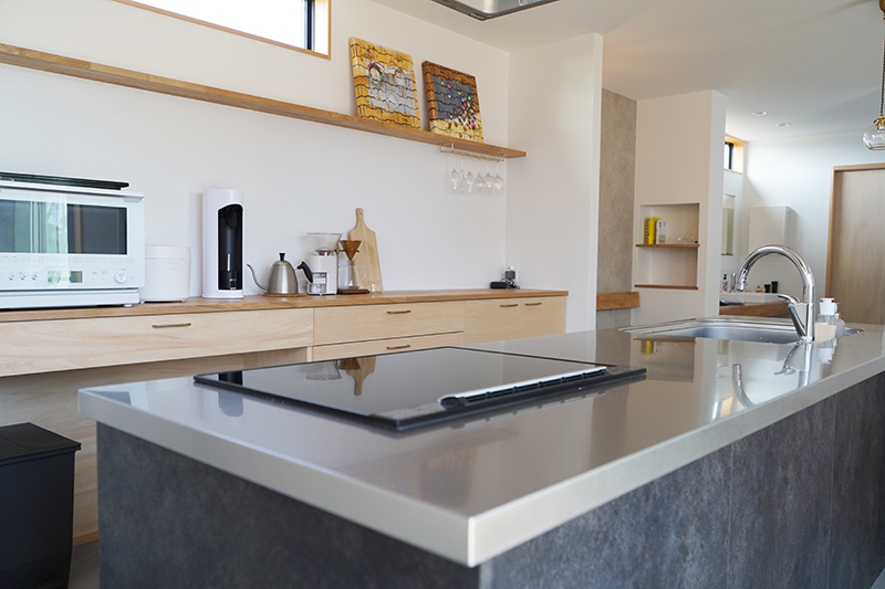 #ガルバリウム外壁 #塗り壁 #無垢の家 #無垢床 #モルタル #土間 #土間収納 #アウトドア #キャンプ道具 #ウッドデッキ #グレーの家 #造作家具 #造作洗面 #造作カップボード #新築